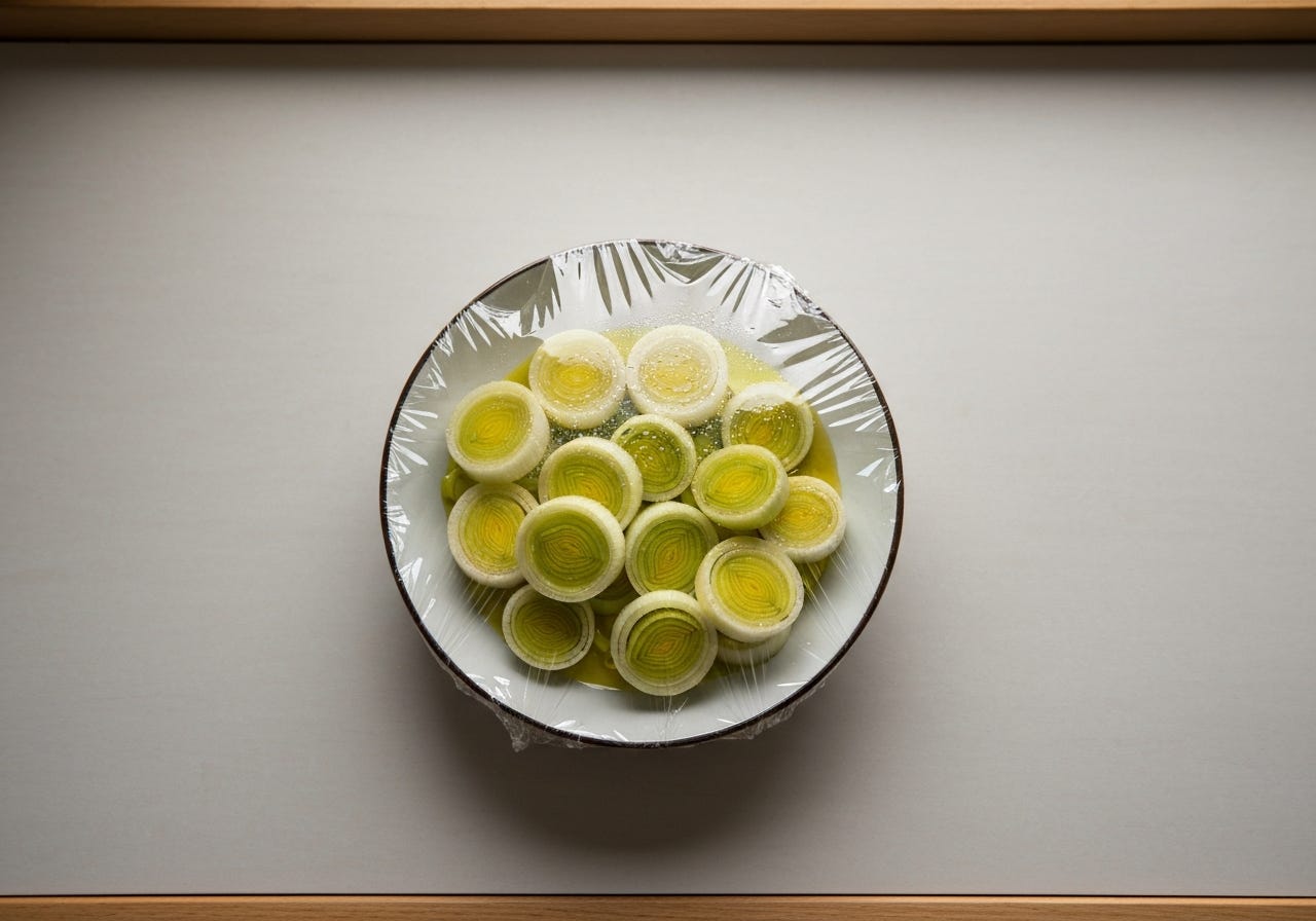 Place the leek and oil in a small microwaveable dish. Cover with clingfilm (plastic wrap) and microwave on high for 4 minutes. Leave to rest, still covered, for a further 2 minutes.