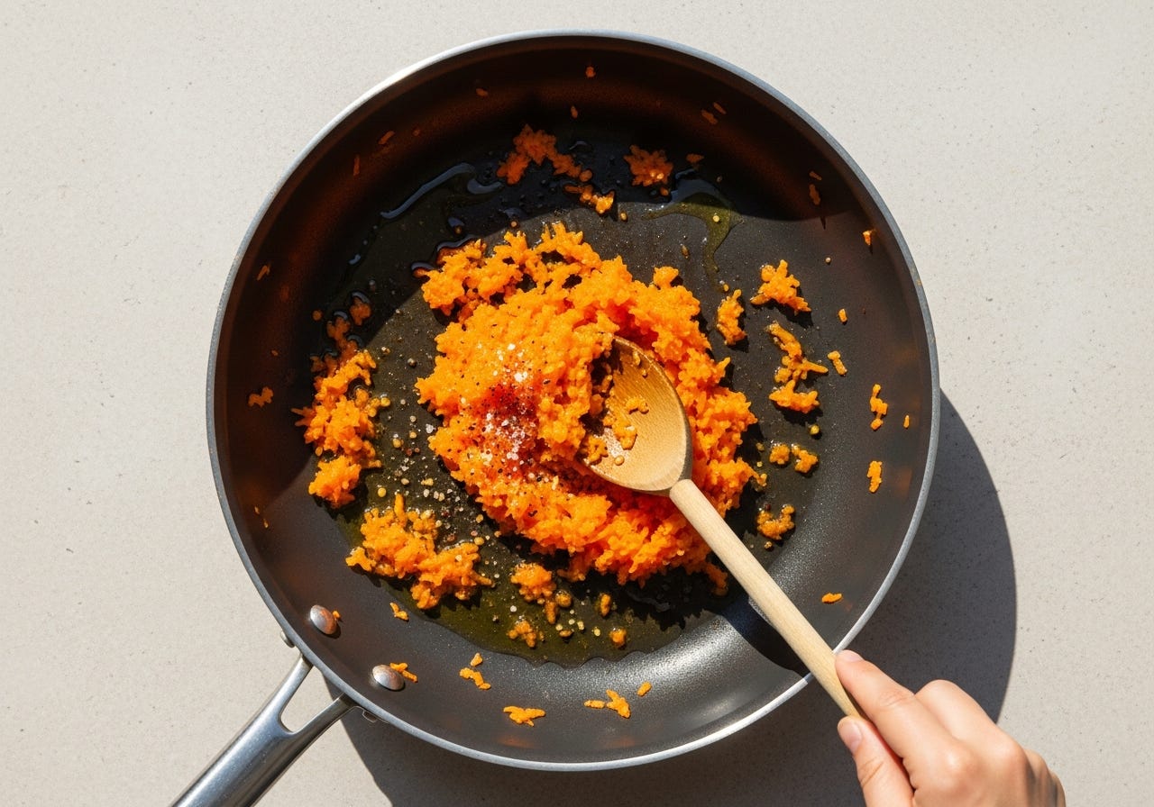 Heat the olive oil in a large frying pan on a med-high heat. Add the grated carrot, season well and fry for 2-3 mins.