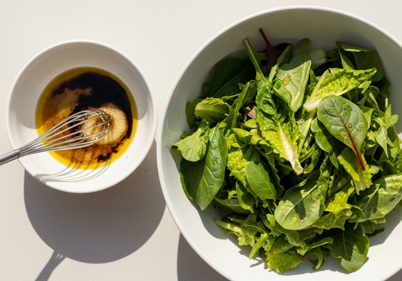 Put the salad leaves in a bowl, pour over the dressing and toss to coat.