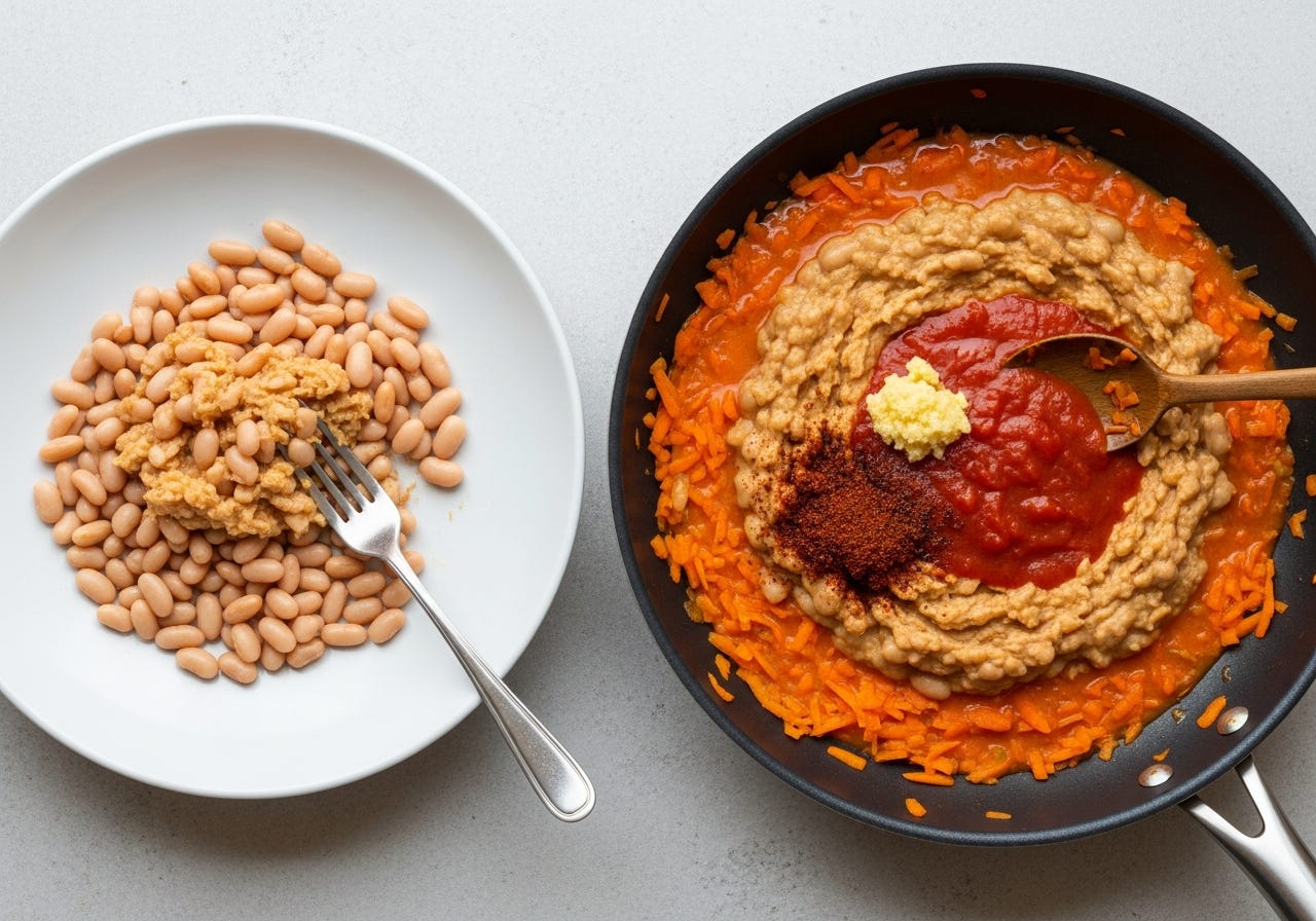 Add the beans and garlic paste to the pan and stir-fry for 30 seconds. Stir in the cajun spice mix, passata, and stock powder. Bring to the boil and simmer gently for 2-3 minutes.