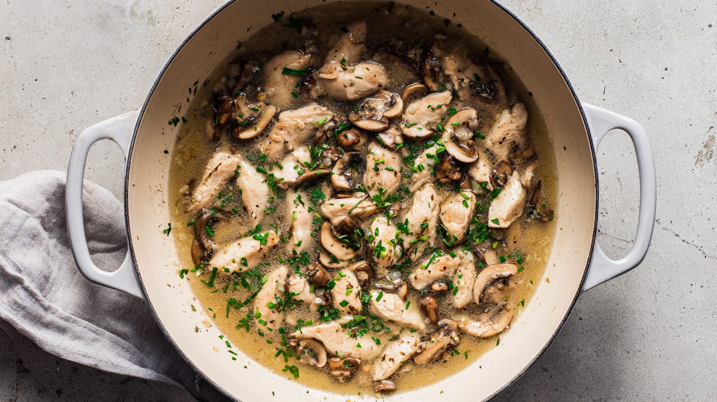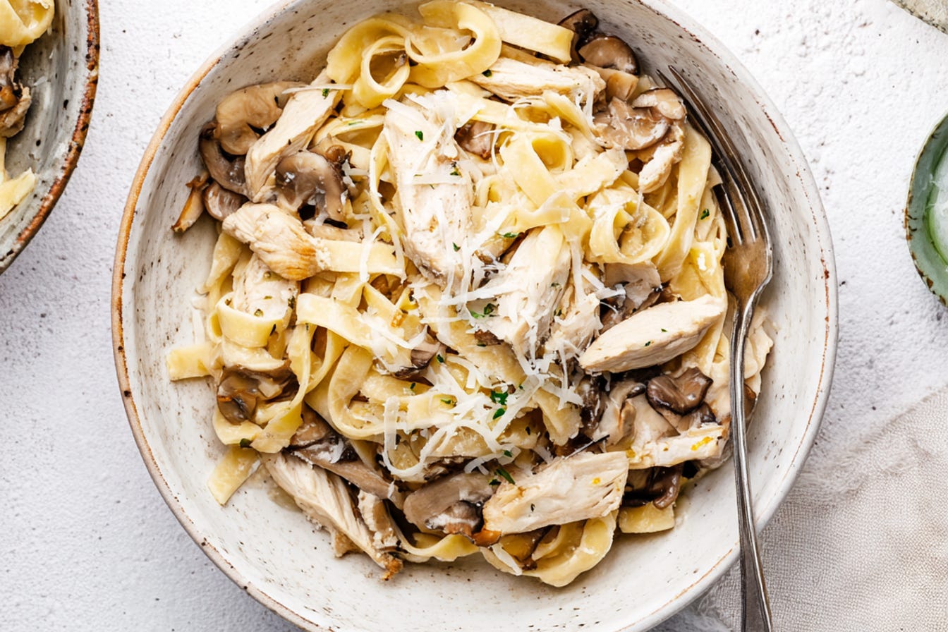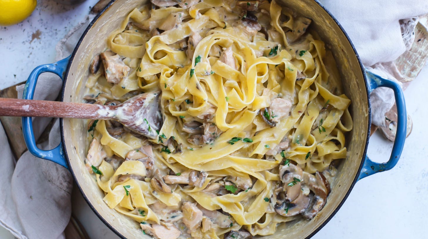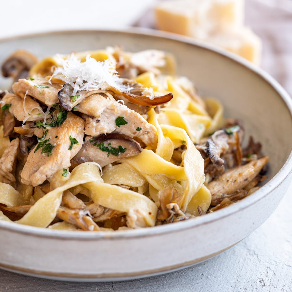 Tender chicken, mushrooms and tarragon in a gentle creamy sauce. An easy, balanced pasta dinner.