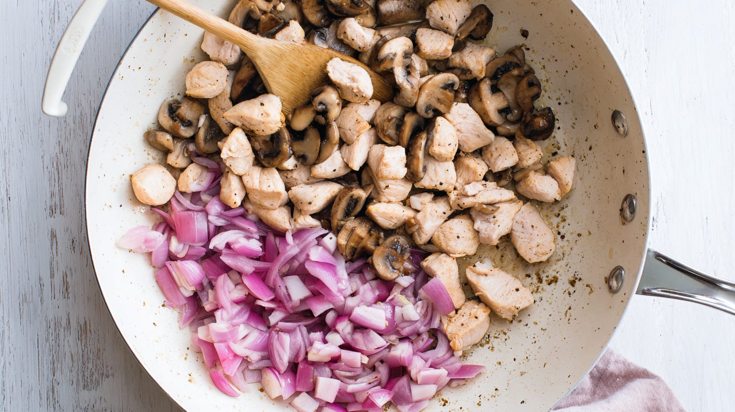 Heat the oil in a wide pan over a high heat. Toss in the diced chicken and sliced onion and fry until the chicken is golden on the outside, 5-6 minutes. Add the mushrooms and fry for a further 4-5 minutes, until the chicken is cooked through.