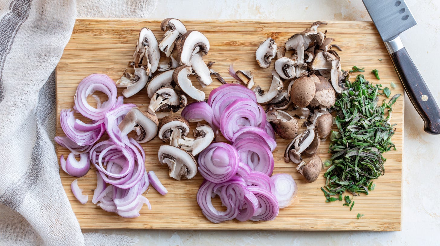 Peel and finely slice the red onion. Wash and slice the mushrooms. Strip the leaves from the tarragon stalk and chop the leaves.