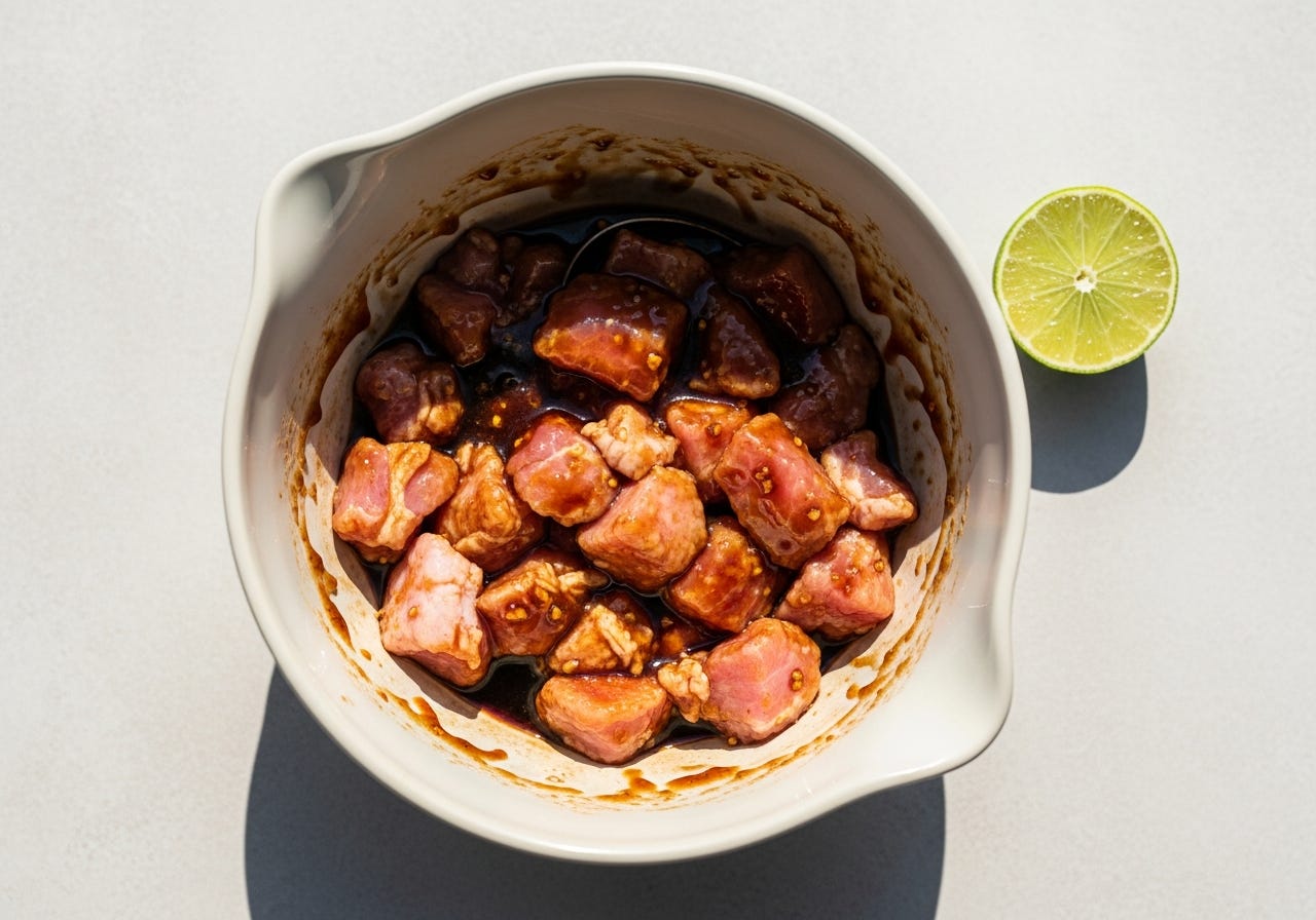 In a bowl, combine the honey, soy sauce, ginger paste, chinese 5 spice powder and the juice of half the lime. Add the pork and toss to coat well.