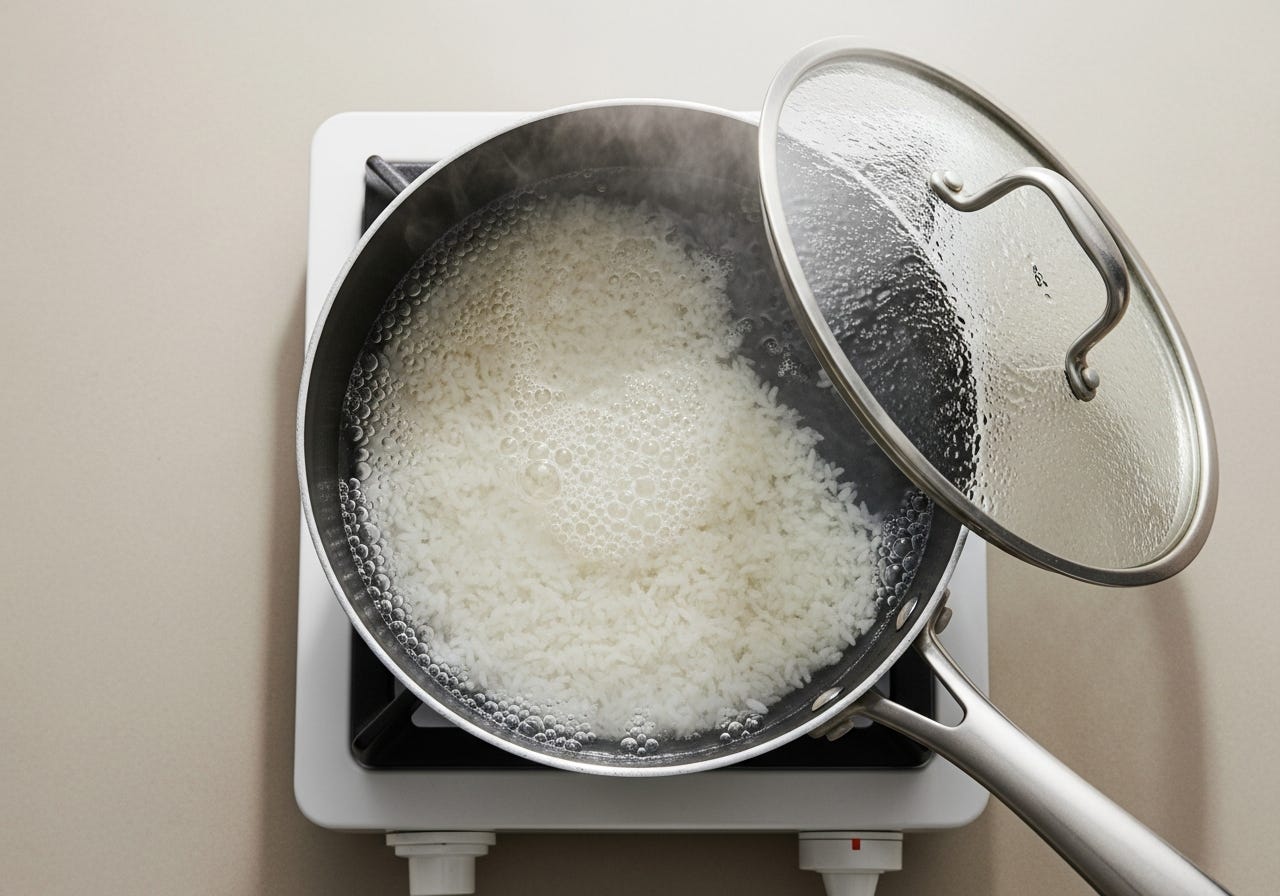 Rinse the rice before adding to a large saucepan. Pour in approx 300ml of boiled water.
