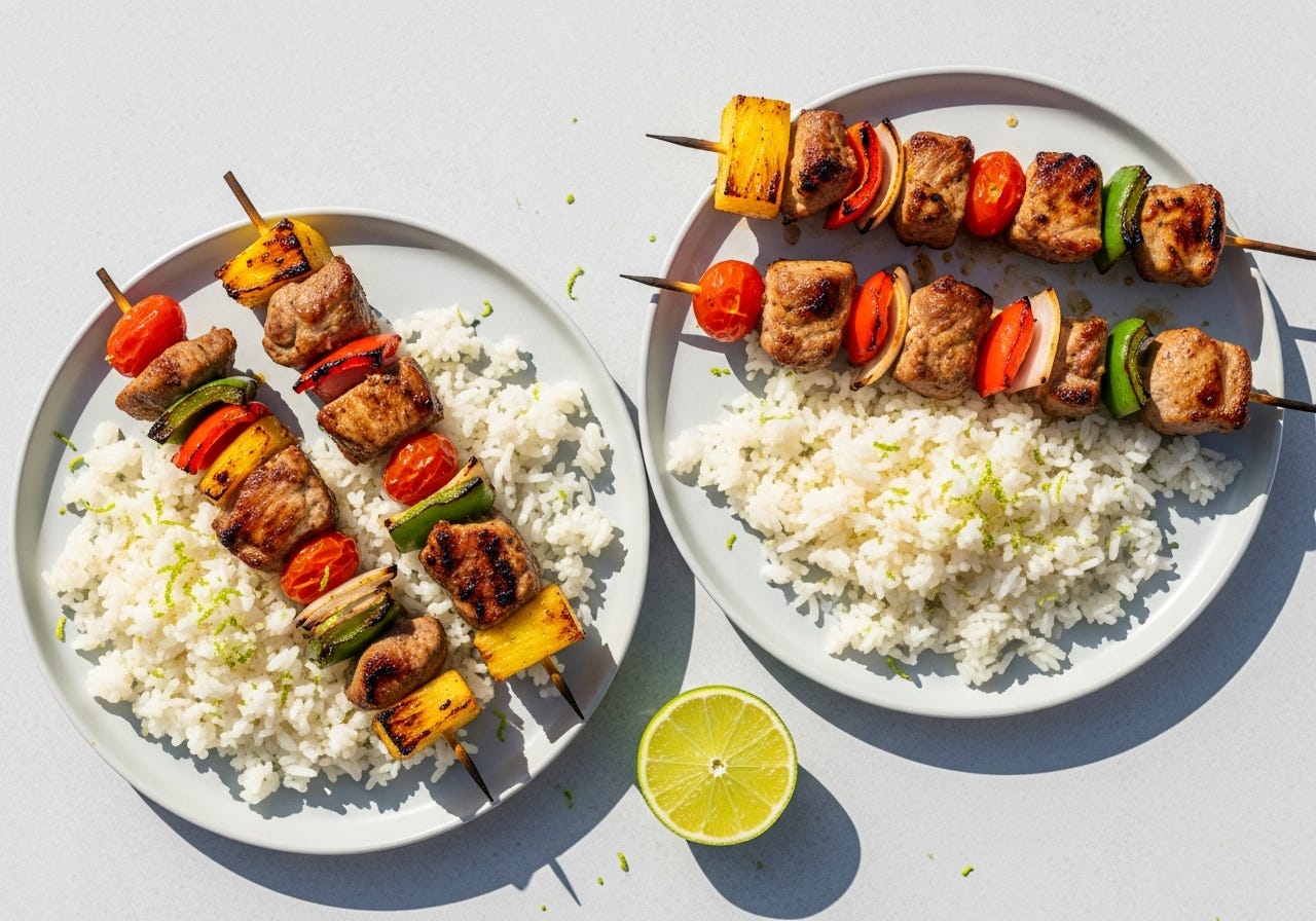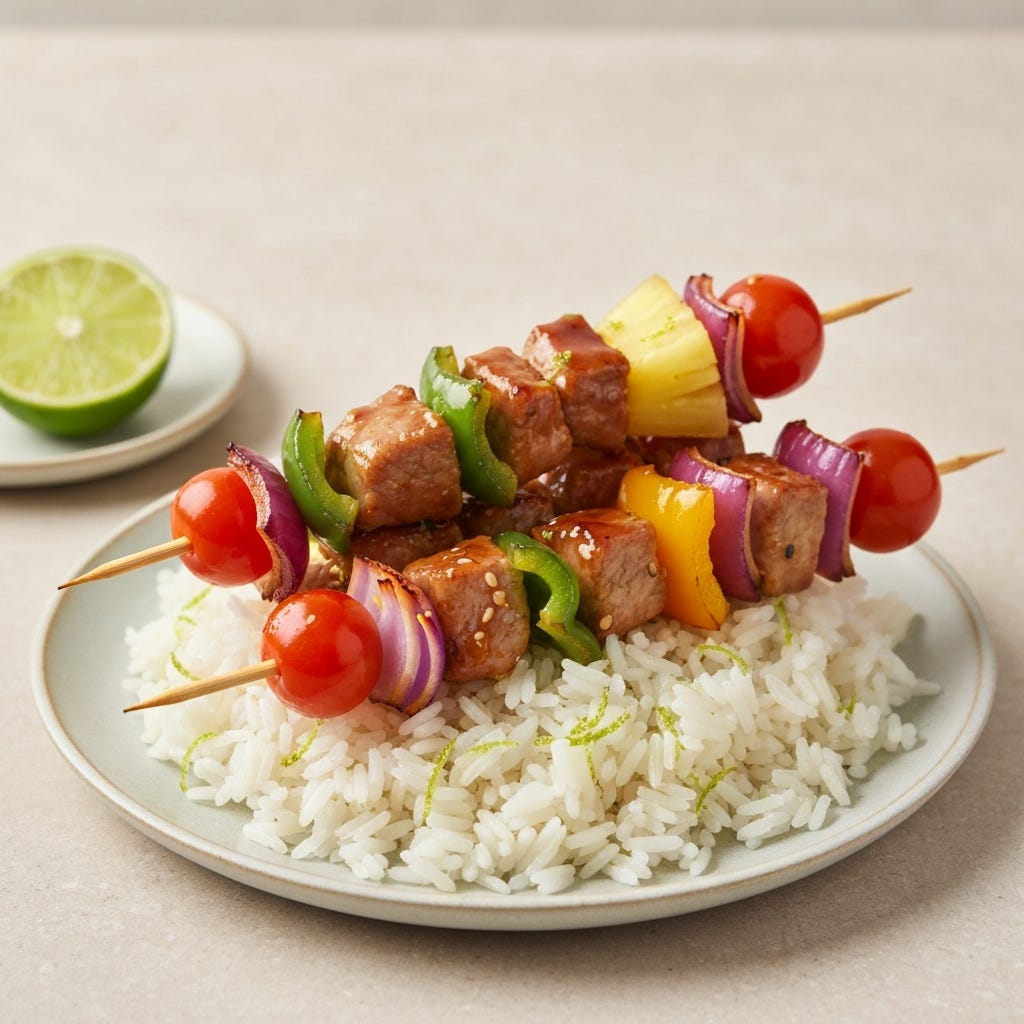 When the rice is cooked, stir in the lime zest and the remaining lime juice. Arrange the rice over your serving plates and top with two kebabs per person.