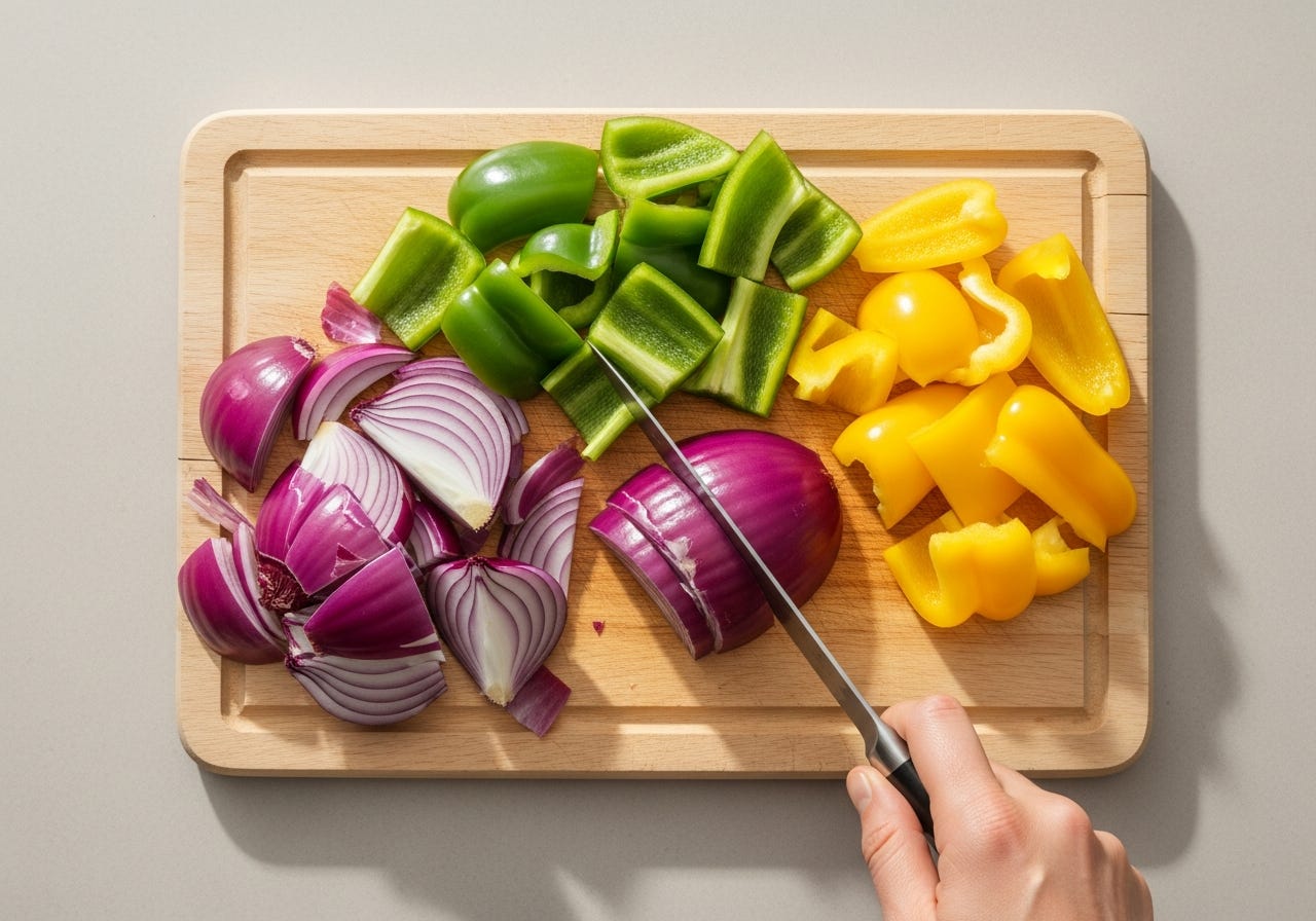 Peel the red onion and cut into chunks. De-seed the green and yellow peppers and chop into chunks.