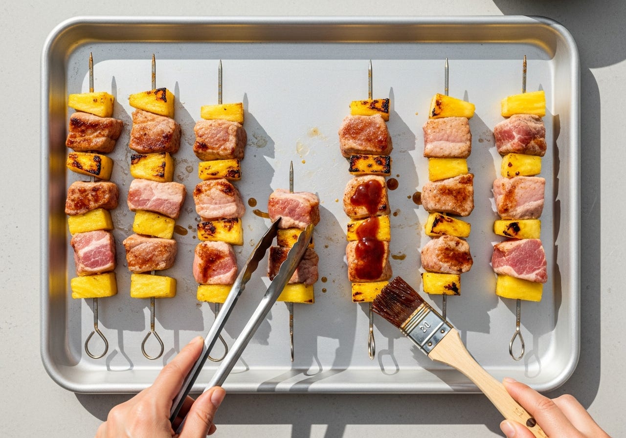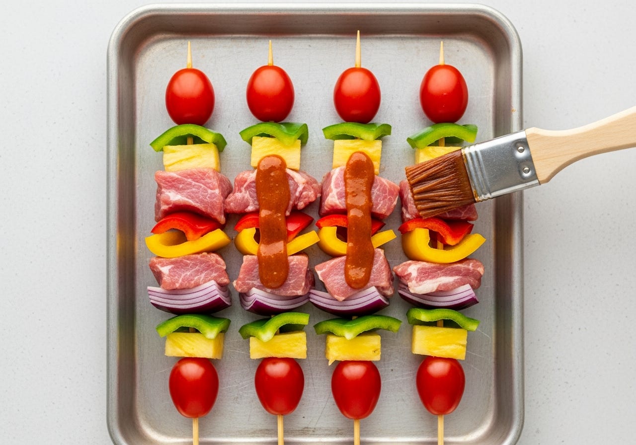 Load up your pork skewers. Start with a cherry tomato, then alternate between pork, peppers, pineapple and onion. Finish with another cherry tomato. Repeat for all 4 skewers. Brush the kebabs with a little of the left over marinade. Cook on the top shelf of the oven for 10 minutes.
