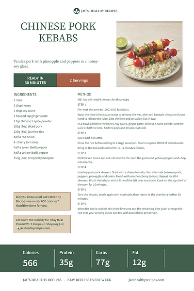 These kebabs hit that lovely sweet and savoury spot that makes dinner feel like a bit of a treat. The pork stays tender in the honey-soy marinade, the pineapple caramelises nicely in the oven, and the peppers add colour and crunch. Everything gets threaded onto skewers. With 35g of protein and under 600 calories, it’s a bright, balanced dinner that works well when you want something that feels fresh and satisfying.