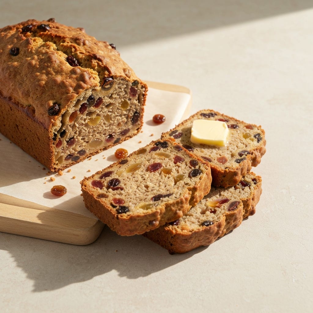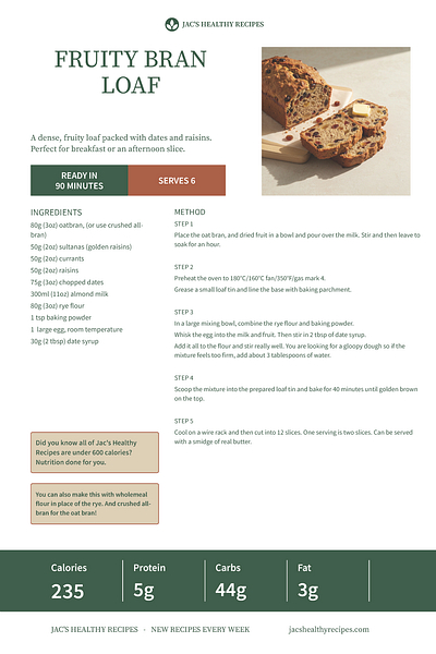 This is a proper, old-fashioned kind of loaf. Dense and fruity, with plenty of dried fruit that gets soft and sweet as it bakes. The oat bran gives it a lovely texture, and the rye flour adds a gentle earthiness that works really well with all that fruit. It’s the sort of thing that feels substantial without being heavy, and a couple of slices make a good breakfast or afternoon treat. At 235 calories per serving, it sits nicely as a wholesome option that doesn’t pretend to be something it’s not.