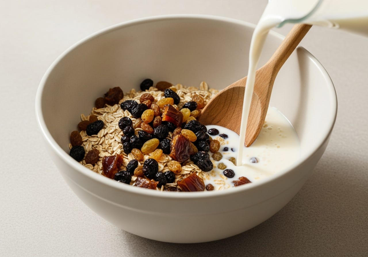 Place the oat bran, and dried fruit in a bowl and pour over the milk. Stir and then leave to soak for an hour.