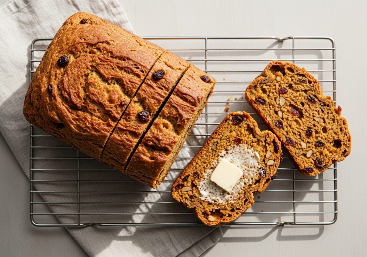 A steady, satisfying loaf that keeps well and gets better after a day or two. Good to have around when you want something naturally sweet and filling.