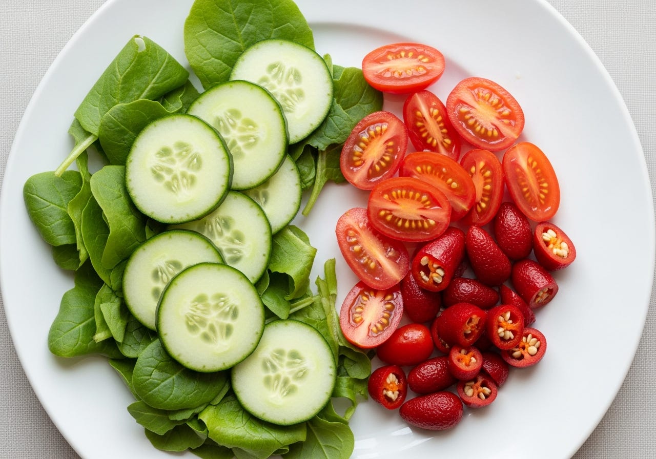 Arrange the salad leaves, cucumber, cherry tomatoes and peppadews on a plate.