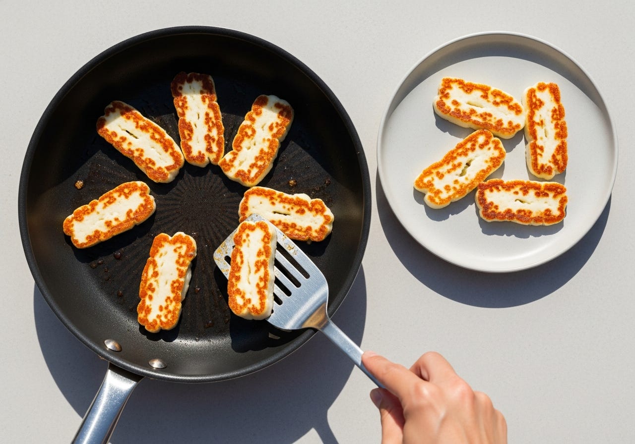 Add the halloumi to the still hot pan. Cook for 1-2 minutes each side, until browned. Remove to a plate when cooked.