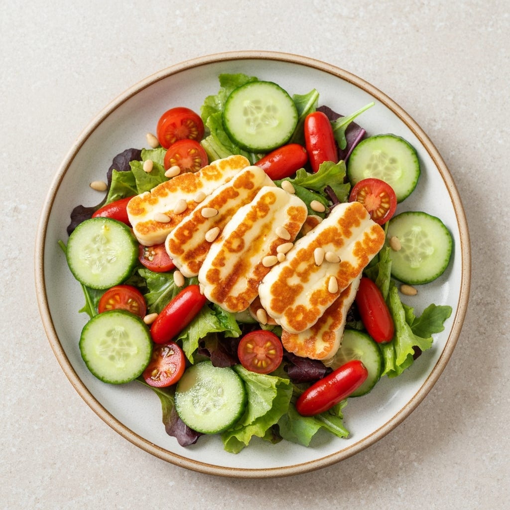 Golden halloumi, crisp salad and toasted pinenuts with a sweet balsamic drizzle. Ready in 5 minutes.