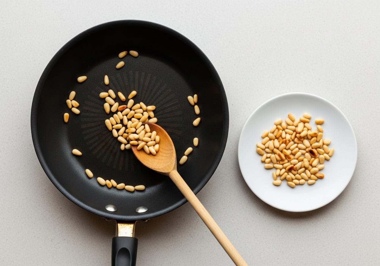 Heat a frying pan on the highest heat. When hot, toss in the pinenuts and toast them until they start to brown, shaking the pan gently regularly. Remove the pinenuts to a plate to cool.
