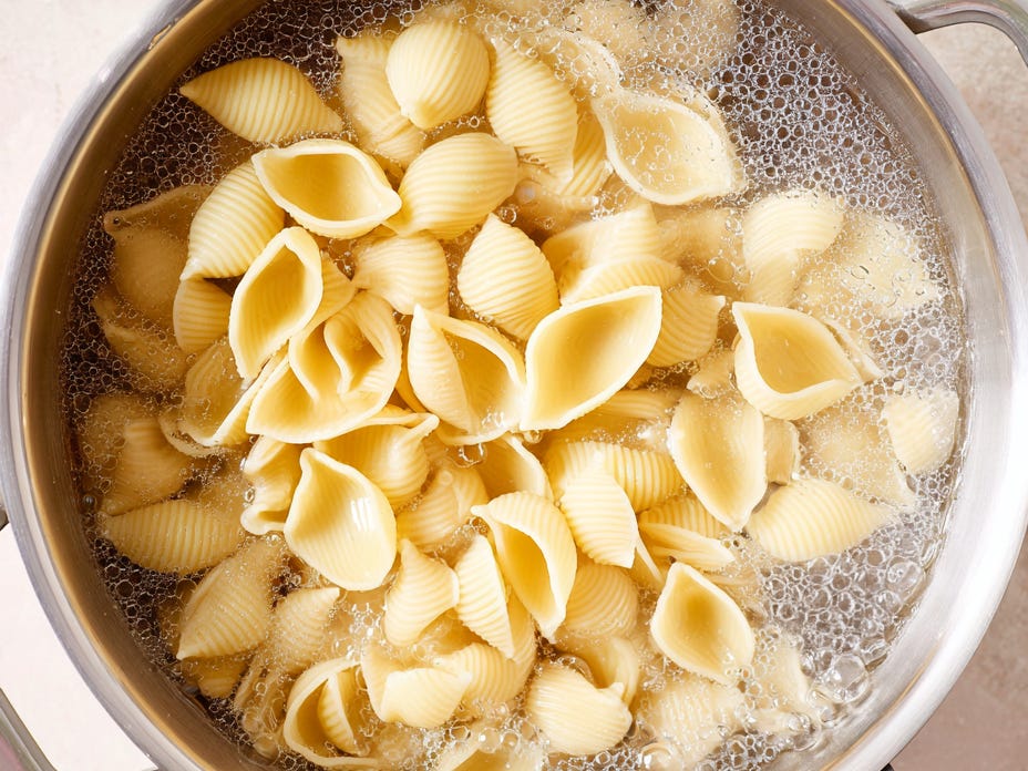 Heat a large pan of water with a little salt and a drizzle of oil. When boiling, add the conchiglie shell pasta and cook for 10 mins.