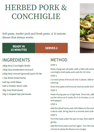 This is one of those quick pastas that does a lot without feeling heavy. The pork cooks fast and brings plenty of flavour, the broccoli keeps it fresh, and the pesto ties everything together at the end. It’s ready in 15 minutes, properly filling, and with 45g of protein it quietly ticks the balanced dinner box without you having to think about it.