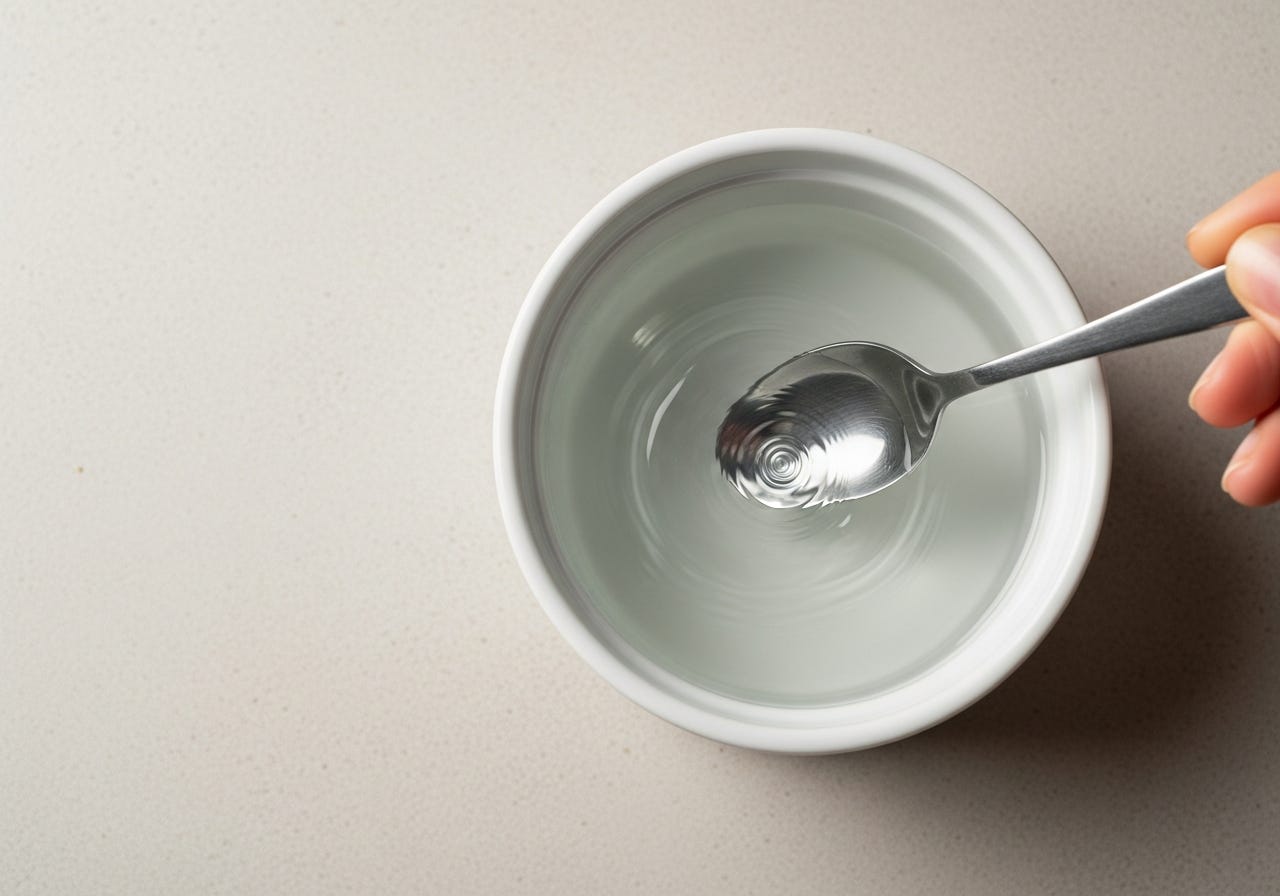 Take a small bowl, cup or ramekin and add the vinegar and water. Use a spoon to swirl the water in the cup.