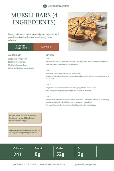 Muesli Bars (4 Ingredients). Quick to prepare and wonderfully versatile. A brilliant make-ahead option for busy weekday breakfasts or afternoon energy boosts when you need something substantial but not too heavy.