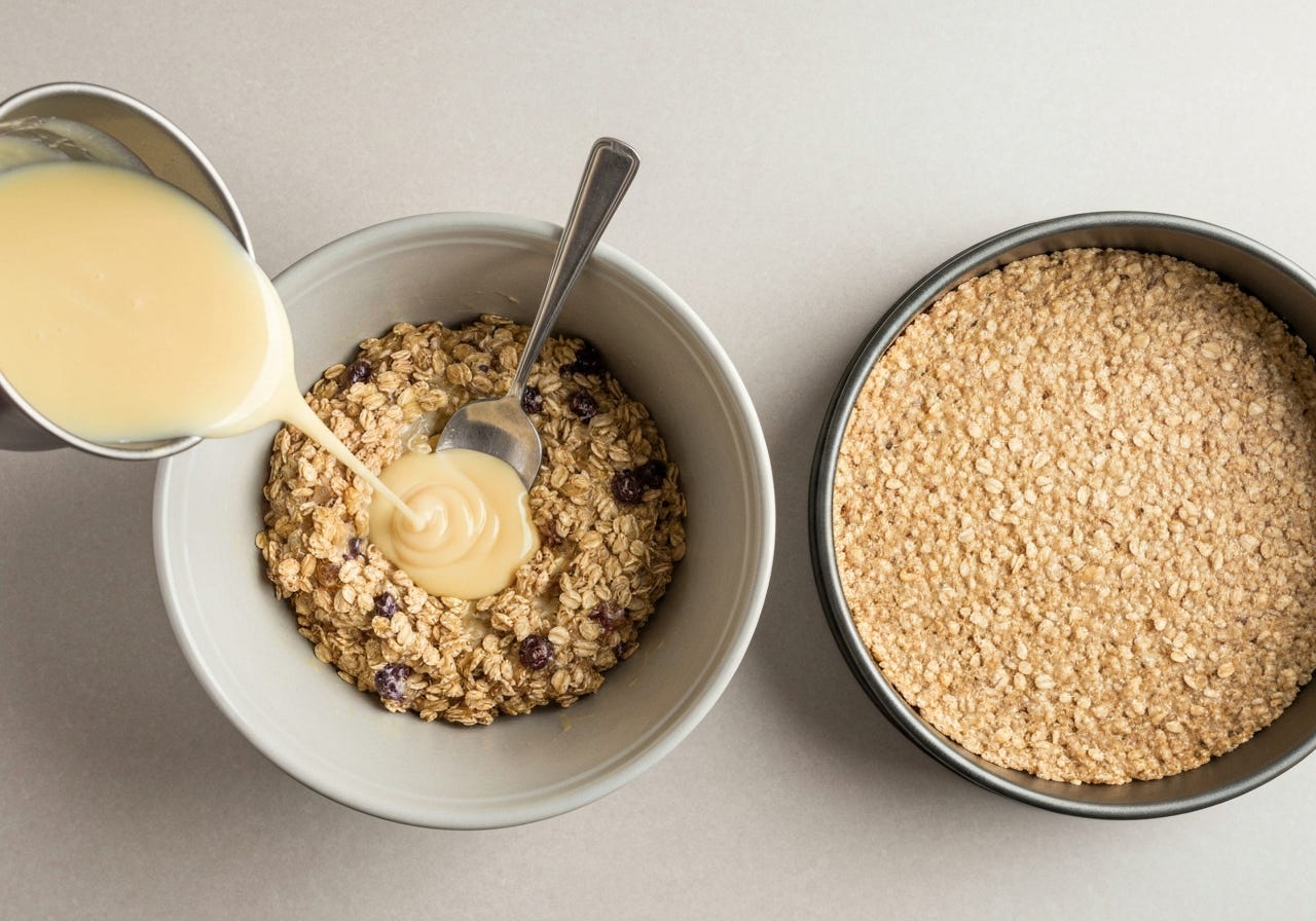 Simply pour the condensed milk into the dry ingredients and stir well.