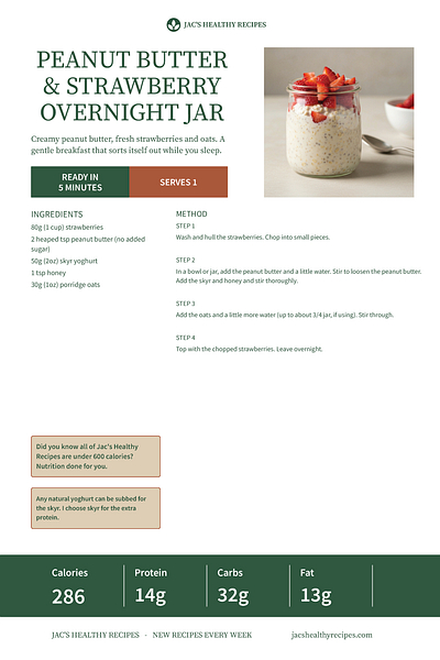 This is one of those quiet breakfast wins that just takes care of itself. You stir everything together the night before, and by morning you’ve got something that feels like a treat but still keeps you steady. The peanut butter makes it properly satisfying, the strawberries add a bit of sweetness, and the oats soak everything up nicely. At 286 calories with 14g of protein, it’s a gentle way to start the day without feeling heavy or rushed.