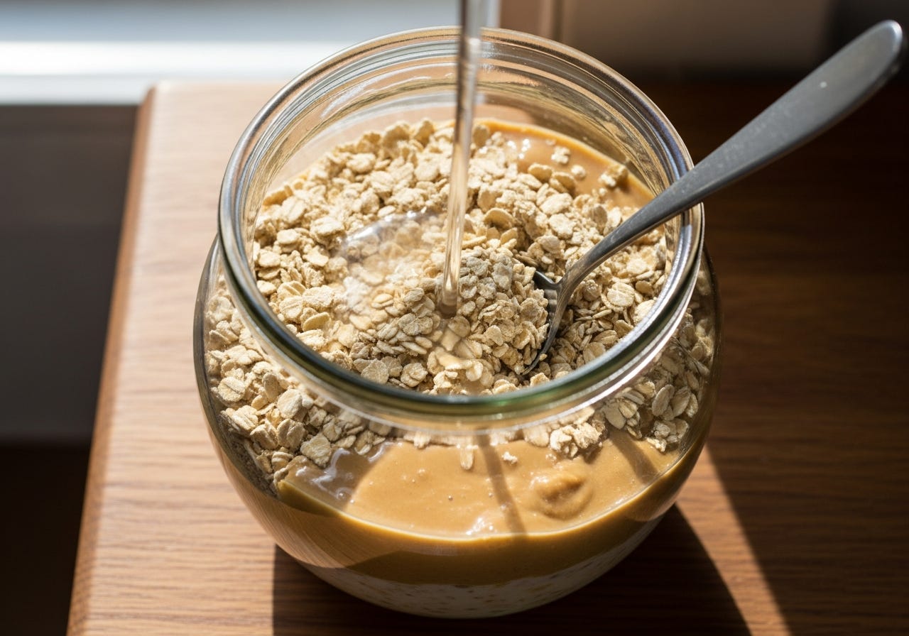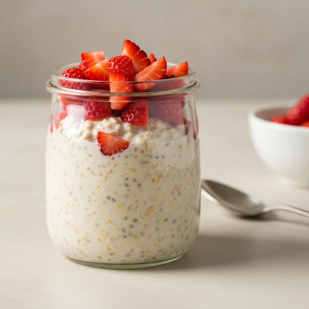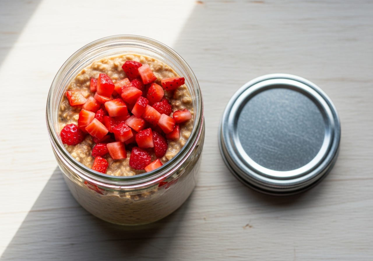 Creamy peanut butter, fresh strawberries and oats. A gentle breakfast that sorts itself out while you sleep.