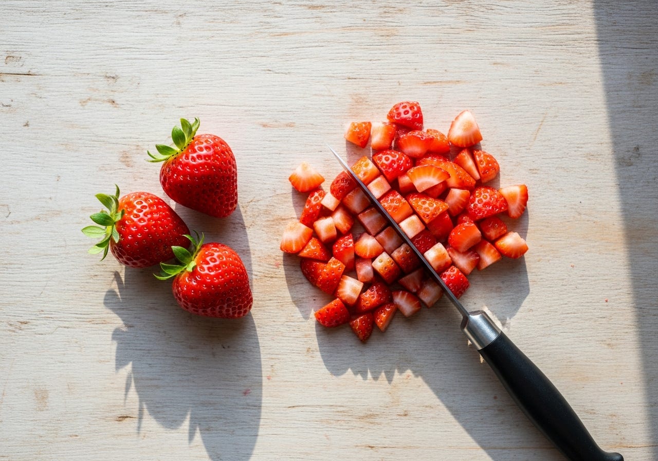 Wash and hull the strawberries. Chop into small pieces.