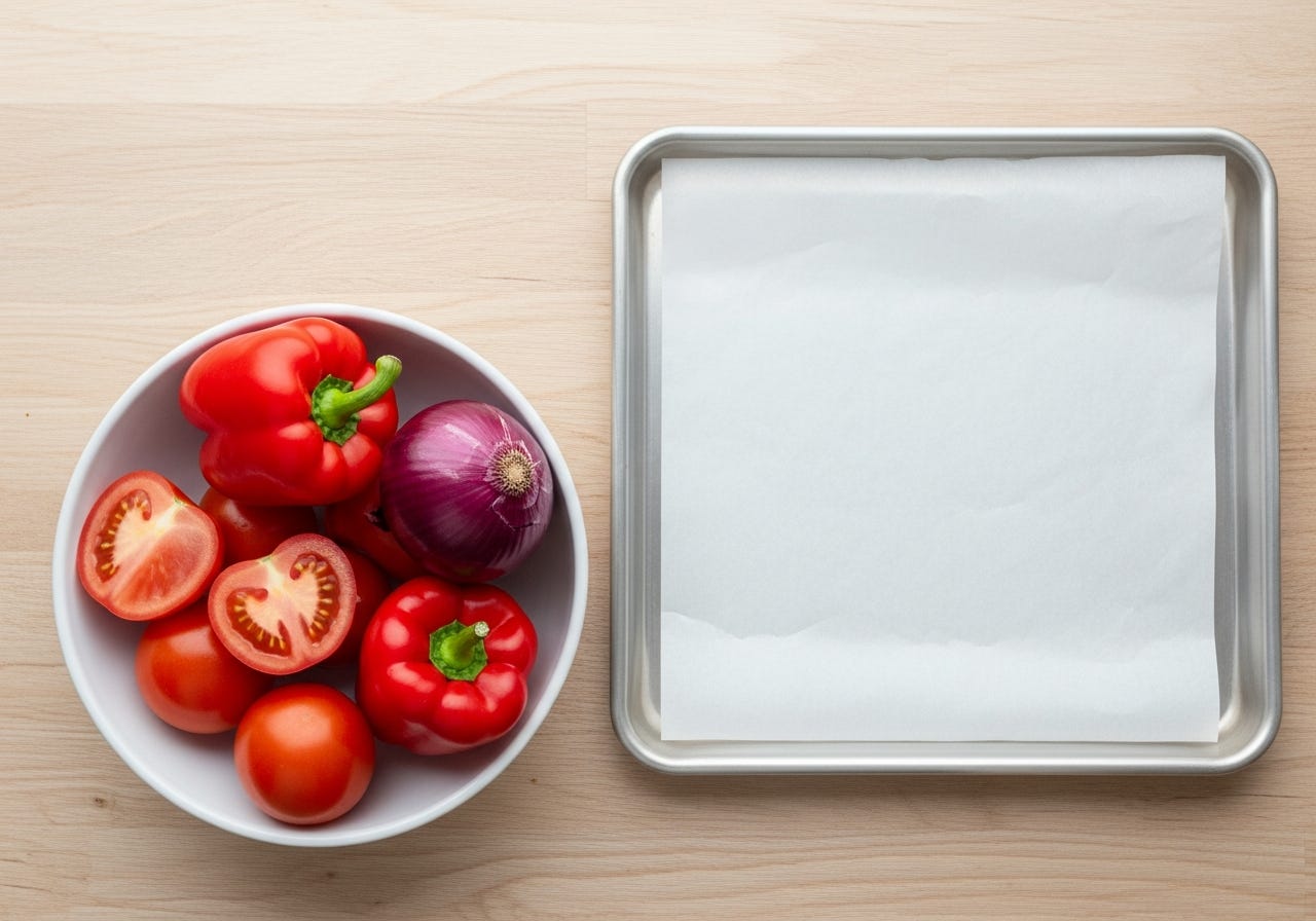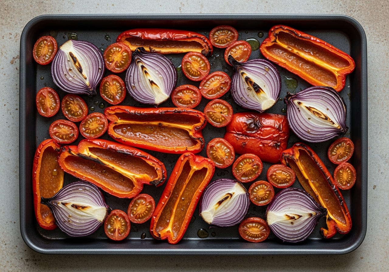 Spread the tomatoes, red onion and red peppers over a baking tray. Drizzle over the olive oil. Roast in the oven for 35-40 minutes.