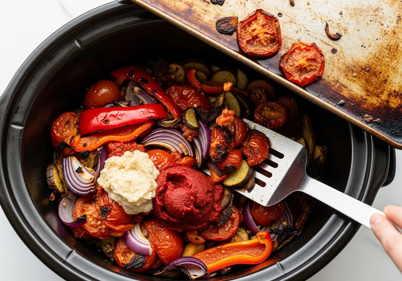 This is a gentle, warming soup that takes care of the work for you. The vegetables roast away in the oven, developing deep flavours while you get on with other things. Once they’re soft and slightly caramelised, everything goes into the slow cooker to simmer quietly until smooth and comforting.