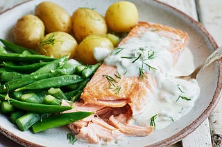 Chunky salmon, new potatoes and a cool creamy dressing. An easy, balanced dinner in 20 minutes.
